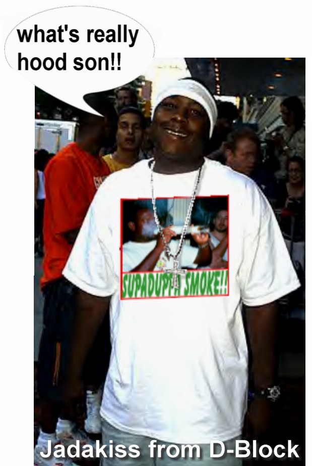 JadaKiss writes: "Whadup kidd I really like what ya'll doin with them tees and shit. Good looks on the low prices too. This JadaKiss the #1 street king from yonkers"... P.S. go get my album the Kiss of Death its comin for the summer of '04 ! 1 love