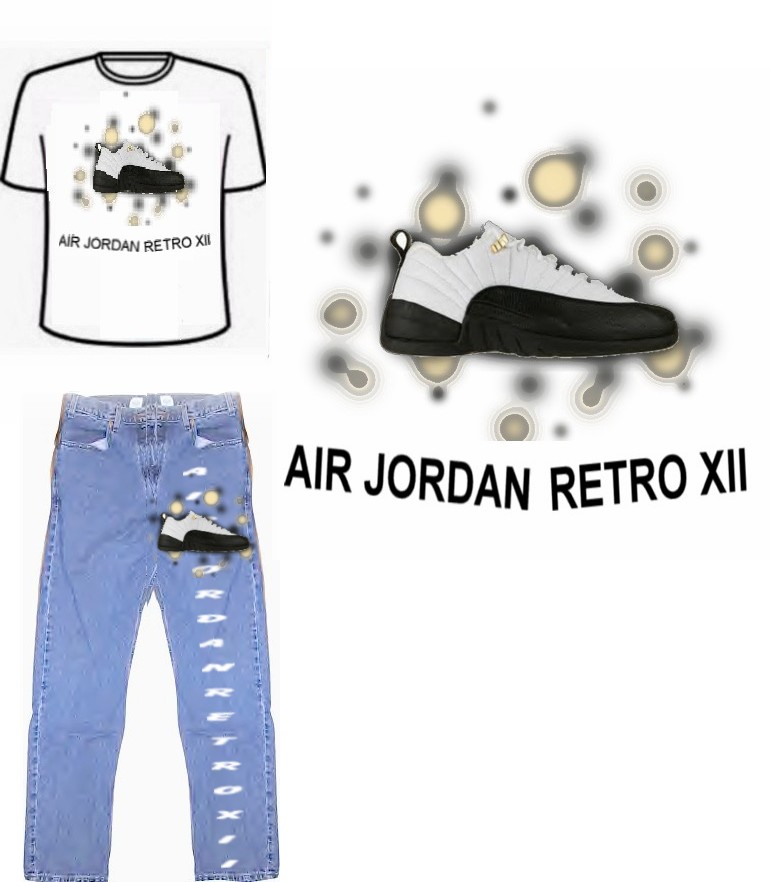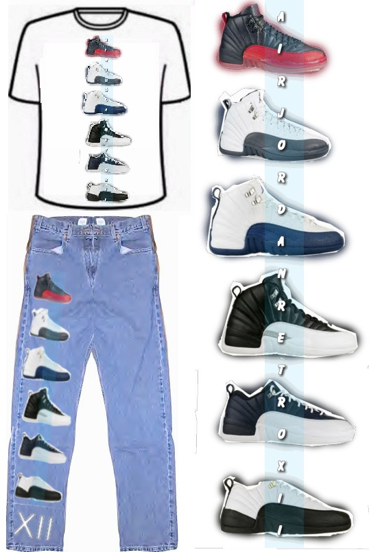 This item consists of the Air Jordan Retro XII pant, and our all new Retro XII customized tee. The pant is included with an acrilic base transfer design of all the released retro shoes on front. "AIR JORDAN RETRO XII" covers the back left leg of the pant. On the front right leg, overlapping the "AIRJORDAN RETRO XII" logo is a vertical arrangement of all the shoes. The tee is also included with an aligned arrangement of all the retro XII mids to correspond with the pant.